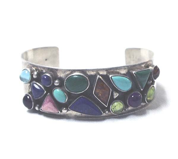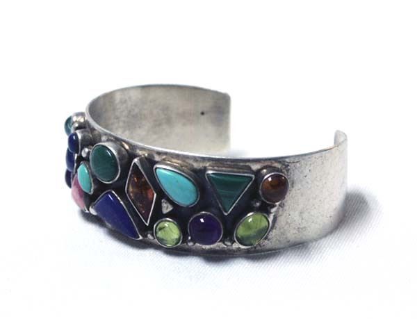 Desert Rose Traders Sterling Silver and Gemstone Bracelet, inside measures 7'' which includes opening x 1''W, hallmarked and stamped .925, total wt. of 48.97g, stones included are lapis, amber, malachite, rhodochrosite, amethyst, peridot, topaz, and turquoise