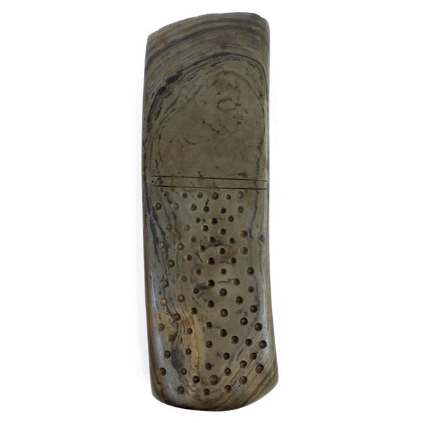 Prehistoric Ohio Banded Slate Axe Head, measures 3'' x 10'', unusual decorative drilled holes on one end, gorgeous stone