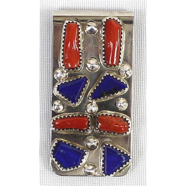 Zuni Sterling Coral & Lapis Money Clip by Curt Cheama, the clip itself is not sterling silver, bezel settings surrounding the lapis & coral ...