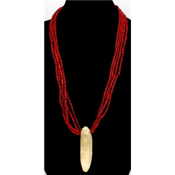 Navajo Five Strand Red Coral Beads with Large Tusk Pendant Necklace, measures 3''L x 1''W. End to End measures 26''. Old S...