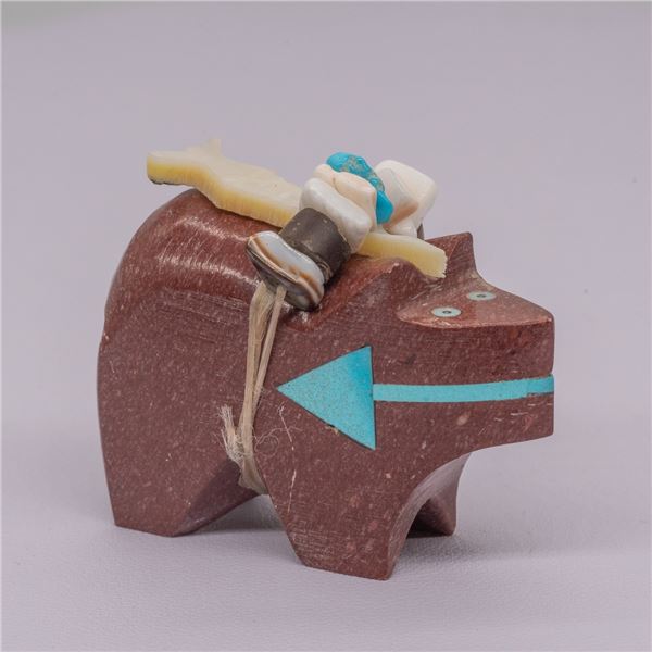 Native American Navajo Pipestone Bear Fetish, measures 1.5'' x 1.5'', turquoise bead eyes, carved mother of pearl arrowhead spirit b...