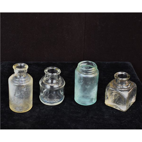 4 Antique Bottles, largest measures 2'' x 3'', includes 1 Aqua Green Bottle, embossed 30 on the bottom 2. Clear Glass Medicine Bott...