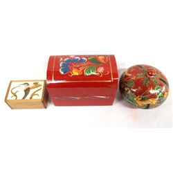 3 Beautiful Ethnic Lidded Boxes, #1 Papier mache' and lacquered box made in Kashmir, #2 Red Painted Folk Art Box, #3 Inlay Wood Hummingbird Trin...