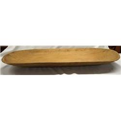 Large Vintage Wooden Batea. 2 Pressure cracks on each end. Measures approx. 2 3/4''H x 31 1/2''L x 18 3/4''W. SHI $35.