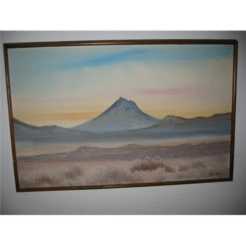 </font></strong>from Artist, Juan Nakai magnificent desert and mountain scene signed and dated in 1966. with writings on the cardboard back of the painting w its original wood old frame. label of a frame shop in city of Tustin in state of California. stunning colors with the accent of primary and pastels are breath taking. 14.5 " T. , 22.5 " W. and 1 " D. it need a designer frame to brighten any establishment. is in excellent condition with old frame. </font>