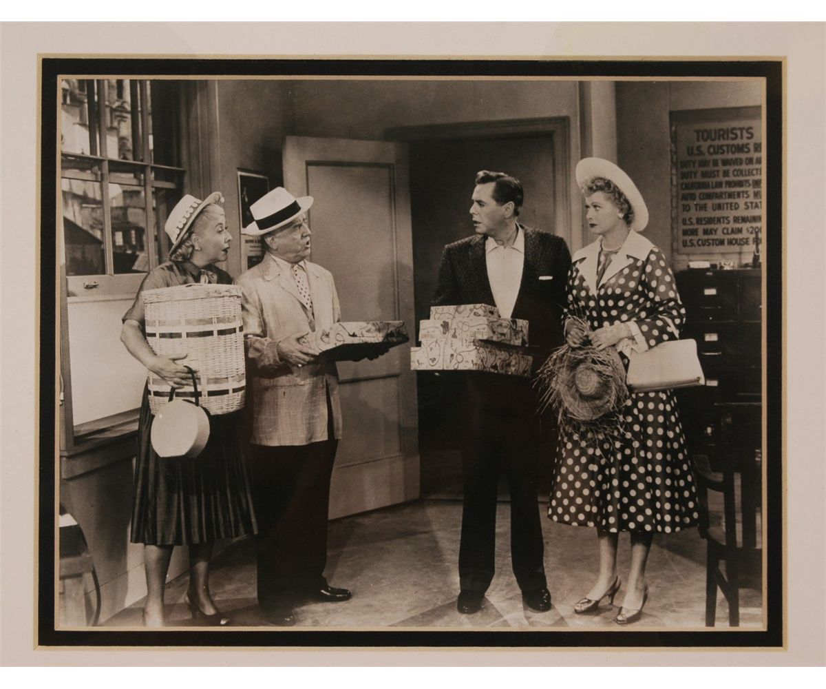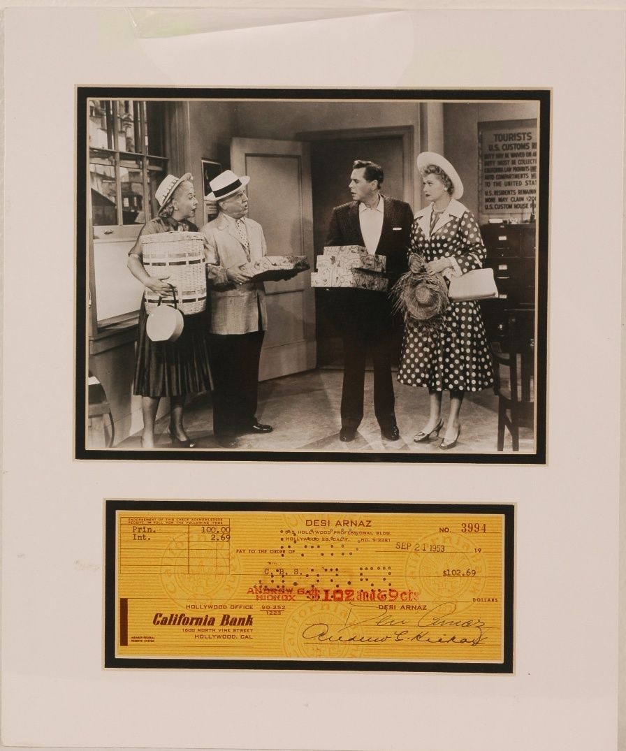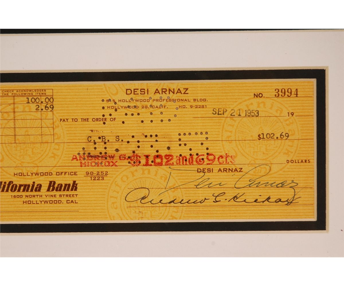 Dated Sept 21, 1953 check made out to C.B.S & Andrew G. Hickox from Desi Arnaz from the Hollywood Office California Bank for the amount of 102.69. Autographed by Desi Arnaz. Double matted and ready to frame with photograph of the I Love Lucy Cast on set. With plastic protective cover. 12.5" x 15".