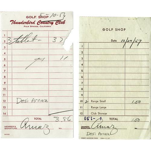 <B>Desi Arnaz Signed Receipts.</B></I> Set of five assorted receipts, dated 1955-57, from the Thunderbird Ranch and Country Club in Palm Springs, each signed by singer-actor-comedian Desi Arnaz. In Excellent condition. <I>With COA from PSA/DNA.</B></I>