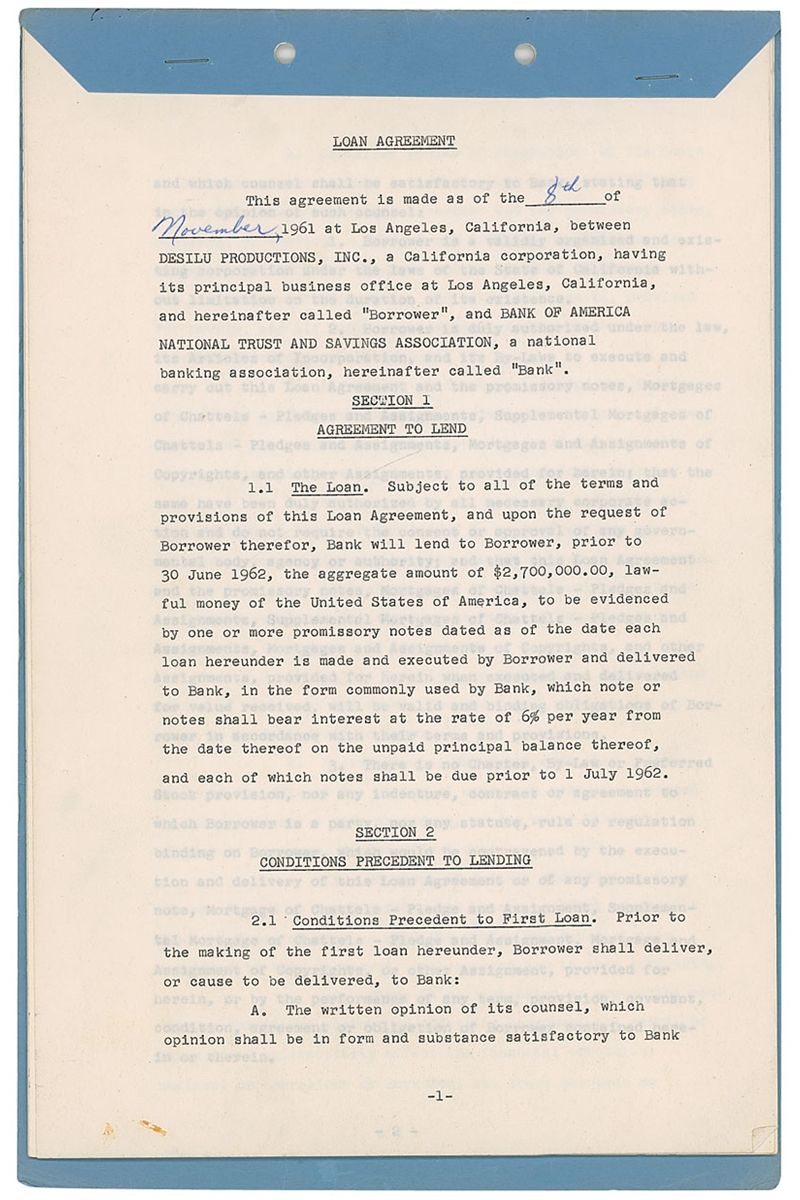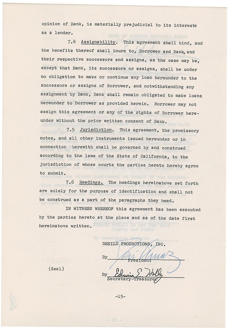DS, 17 pages, 8.5 x 13, November 8, 1961. Agreement between Arnaz and Bank of America, with the bank loaning Desilu Productions $2,700,000 at six percent interest. Signed on page 15 by Arnaz as the corporation’s president. Document is stapled into its original blue folder. In fine condition, with staple and punch holes to top edges and a few light creases. Accompanied by a full letter of authenticity from PSA/DNA.