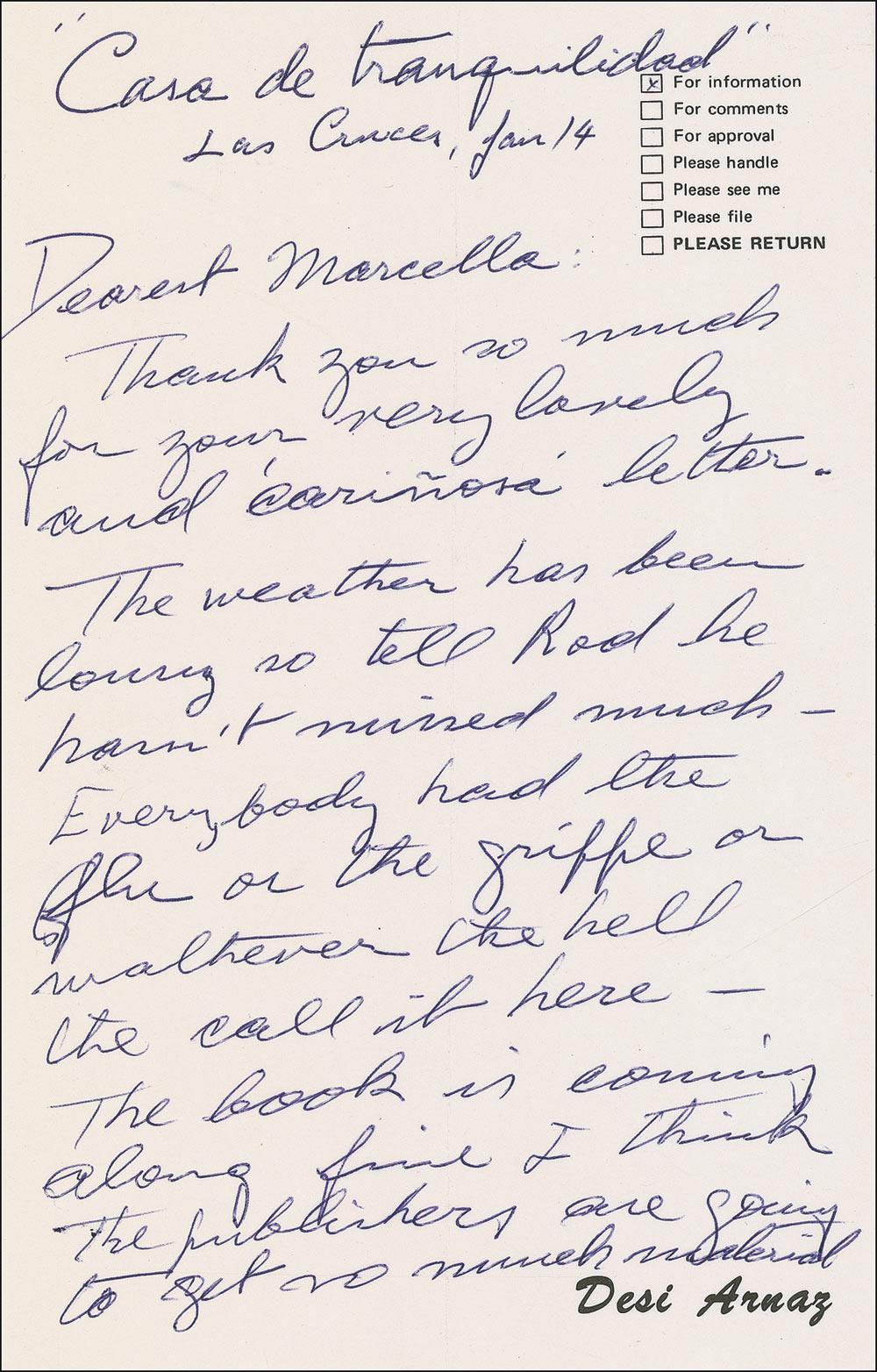 ALS signed “Desi,” two pages, 5.5 x 8.5, personal letterhead, January 14. Letter to Marcella, written from “Casa de Tranquilidad.” In part: “The weather has been lousy so tell Rod he hasn’t missed much—everybody had the flu or the grippe or whatever the hell they call it here—The book is coming along fine. I think the publishers are going to get so much material they may decide to call it ‘the rise and fall of the Cuban empire.’” In fine condition, with central horizontal folds, one through a single letter of signature, and a few light wrinkles. Pre-certified PSA/DNA and RRAuction COA.