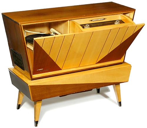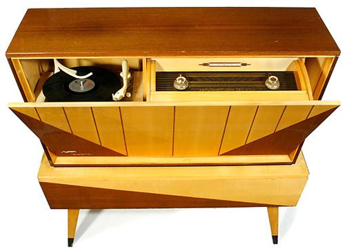 Design Radio Combination "Kuba Tango", 1959 With electric opening door, 6 AM circuits, broadcast: long wave, short wave and FM, 8 valves, 5 loudspeakers, with record changer for 10 discs, wooden case in good condition, size: 471/2 x 19 x 39 in. Radio is in working condition. - A nice addition to any "Kuba Comet"!<Br>