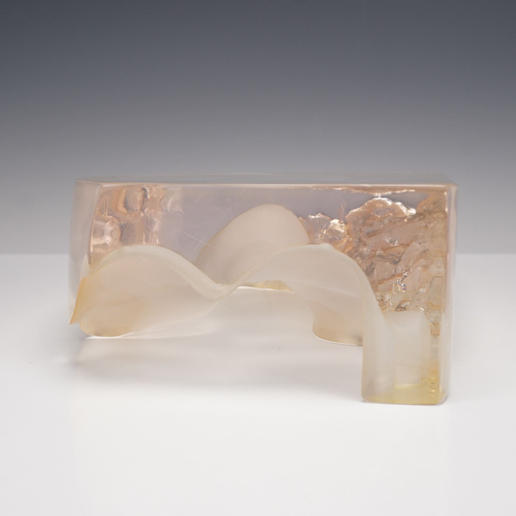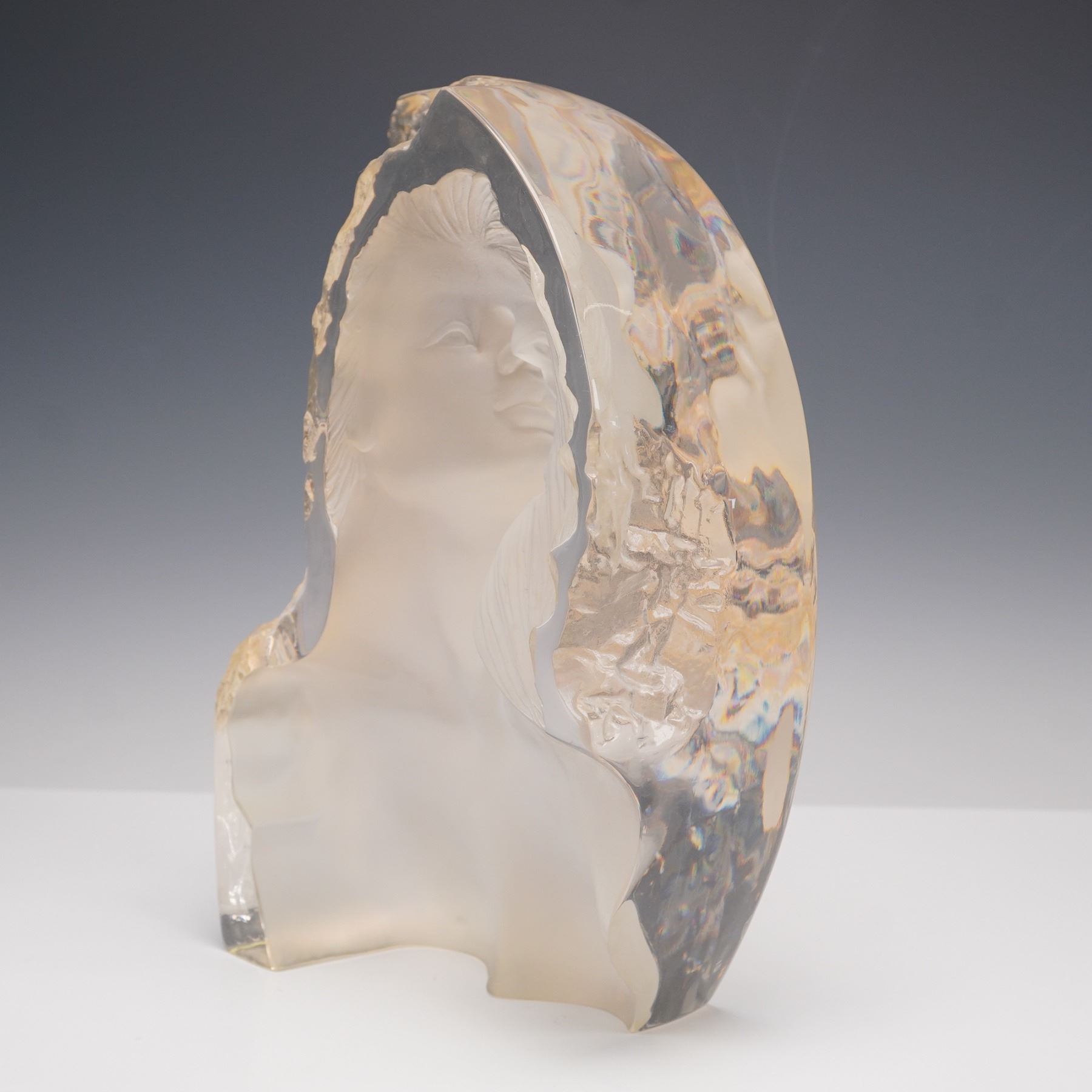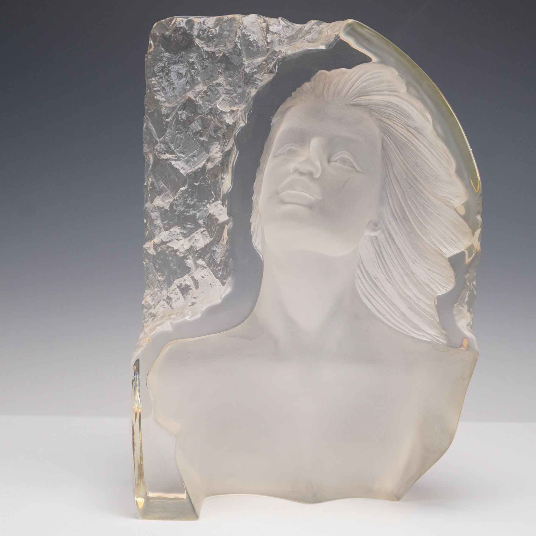 A striking resin sculpture by classically trained artist Carlo Bronti, titled Reflections of Romance. Crafted to replicate the crystalline qualities of deeply hand-cut art glass. The design features a woman's bust emerging from a solid block form, with frosted detailing to the face and torso contrasted against rugged, etched textures. The composition captures both beauty and drama, presenting an almost lifelike presence that reflects Bronti's mastery of the resin medium.