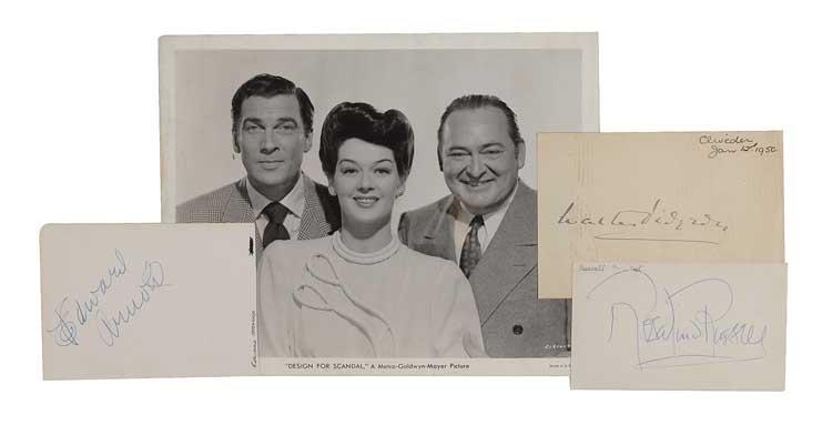 Vintage ink signatures of Rosalind Russell, Walter Pidgeon, and Edward Arnold on individual off-white album pages. Accompanied by a glossy 10 x 8 MGM promotional photo for the film. Small collector’s notations to all three, and magnetic album toning lines to Pidgeon‘s page, otherwise fine condition. Pre-certified PSA/DNA and RRAuction COA.