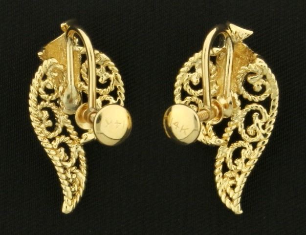 In 14k yellow gold. Fantastic workmanship and design. 1" long with screw backs. 4.3g.