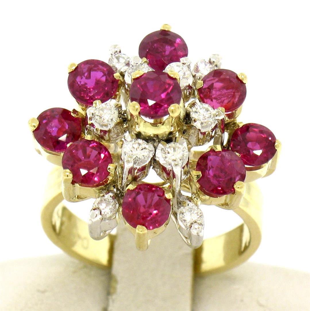 One Designer 14k Two Tone Gold 2.60ctw Vivid Ruby & Brilliant Diamond Cocktail Ring. Item Details: Material: 14k Solid Yellow and White Gold, Weight: 6.9 Grams, Stone(s): (9) Natural Genuine Rubies - Round Brilliant Cut - Prong Set - Pure, Vivid, Blood Red Color - 2.35ctw (approx.), (10) Natural Genuine Diamonds - Round Brilliant Cut - Prong Set - VS1/VS2 Clarity - F/G Color - 0.25ctw (approx.), Total Carat Weight: 2.60 (approx.), Ring Size: 4.25 (We can custom size this ring.), Ring Width: 17.68mm, Ring Height: 11.68mm rise off the finger, Condition: Like New!