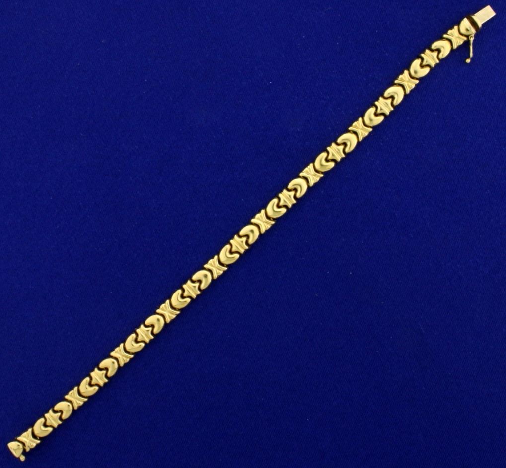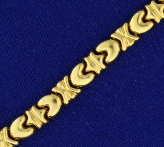 In 18k yellow gold, 7 1/2 inch long and 6.1mm wide with safety clasp. 16.3g.