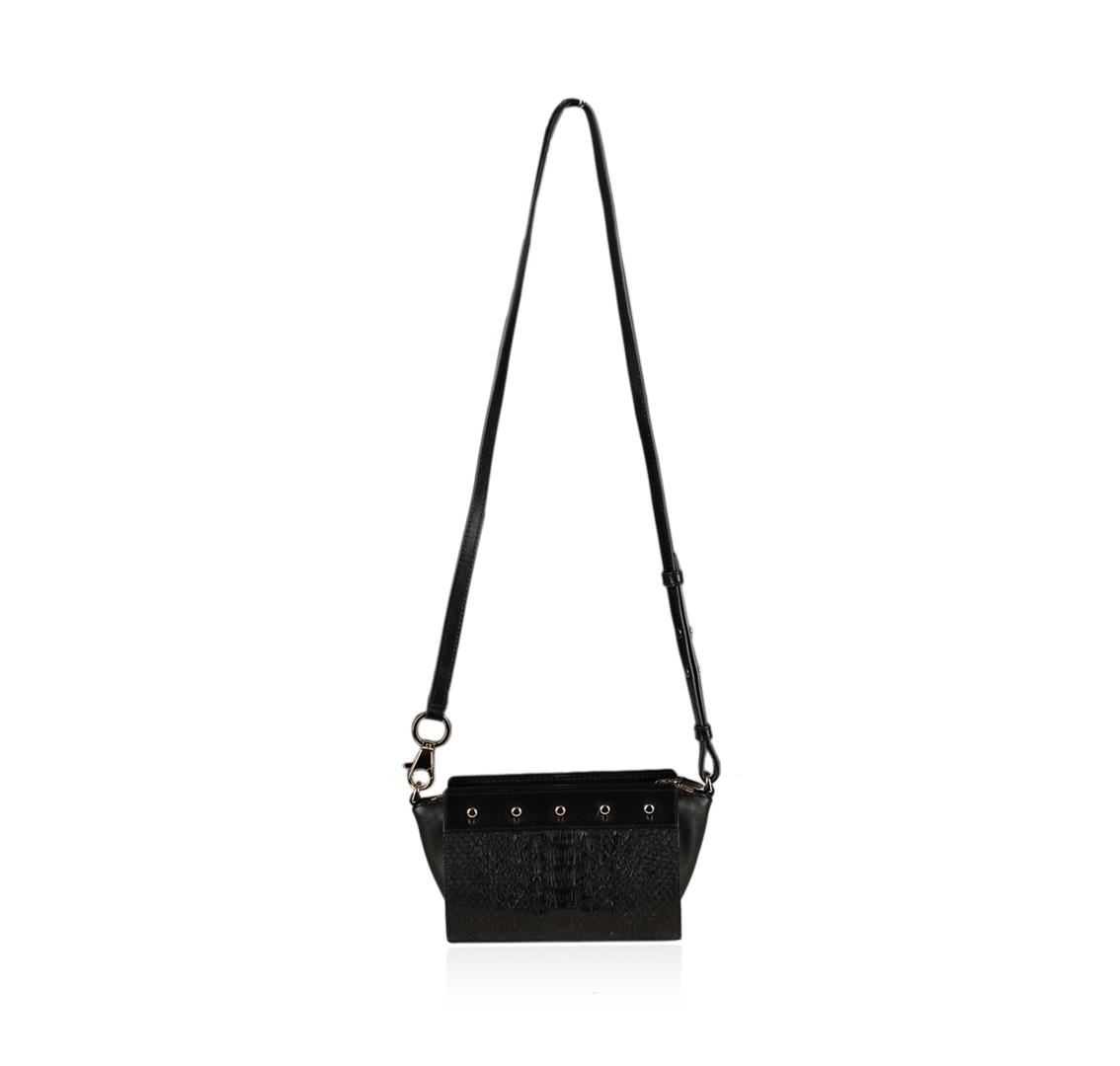 New with tags Alexander Wang black leather convertible Pelican Sling Bag styled with an optional Python Cover. Exterior Python cover removed so bag can be worn with smooth-leather finish at front and back; polished gold tone hardware. Lined with suede. Slip pocket at interior, detachable, adjustable shoulder strap, Top zip closure, 6.0" Height x 8.0" Width x 4.5" Depth (approx.), 23" Maximum strap drop (approx.), Imported.