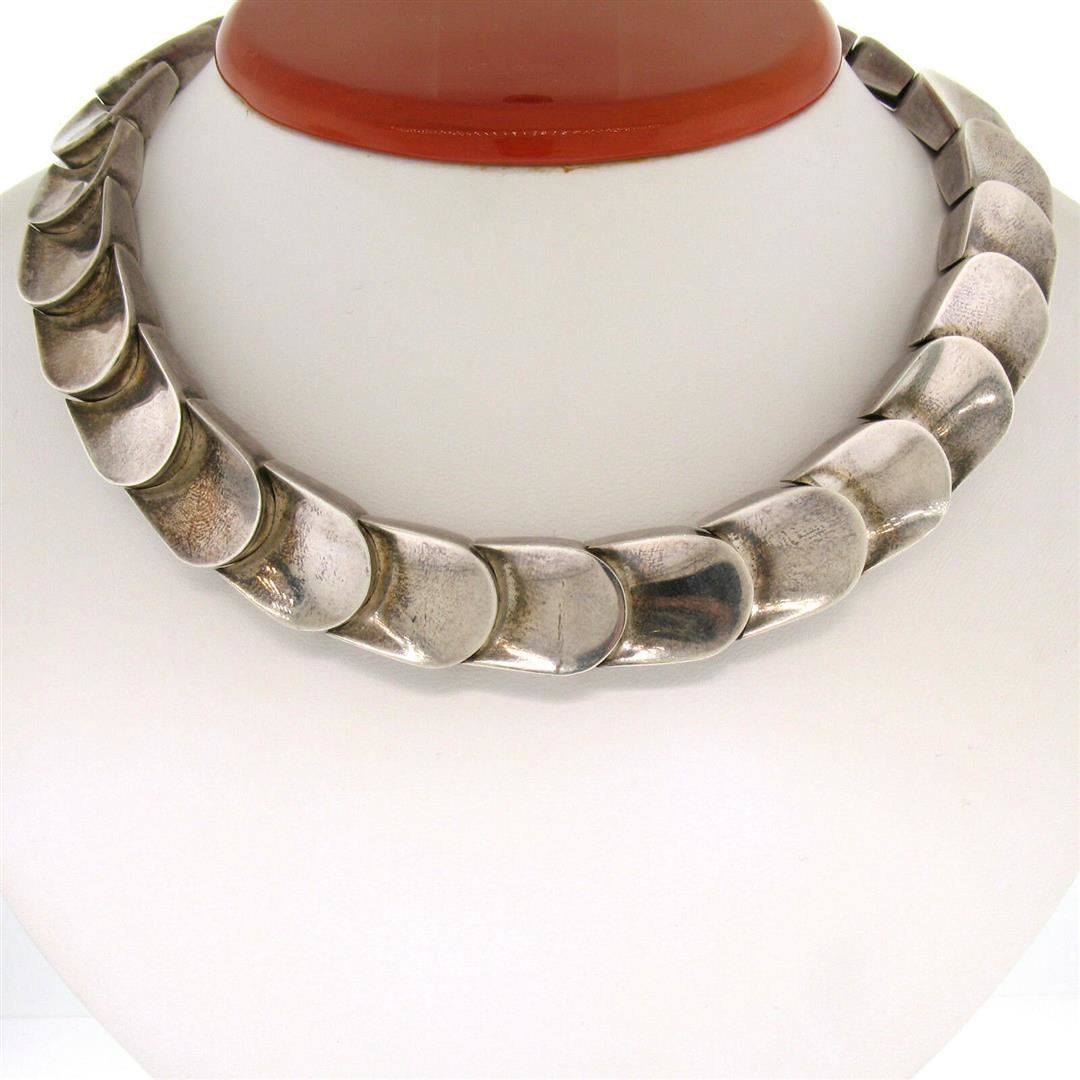 One Designer Alicia Mexico Solid .970 Silver Wide Scalloped Grooved Choker Necklace. Item Details: Material: Solid .970 Silver, Weight: 133.0 Grams, Chain Length: 13.5 Inches, Chain Width: 15.5mm, Chain Thickness: 6.5mm, Clasp: Box Clasp, Condition: Shows minimal tarnishing - Overall excellent, ready to wear condition!