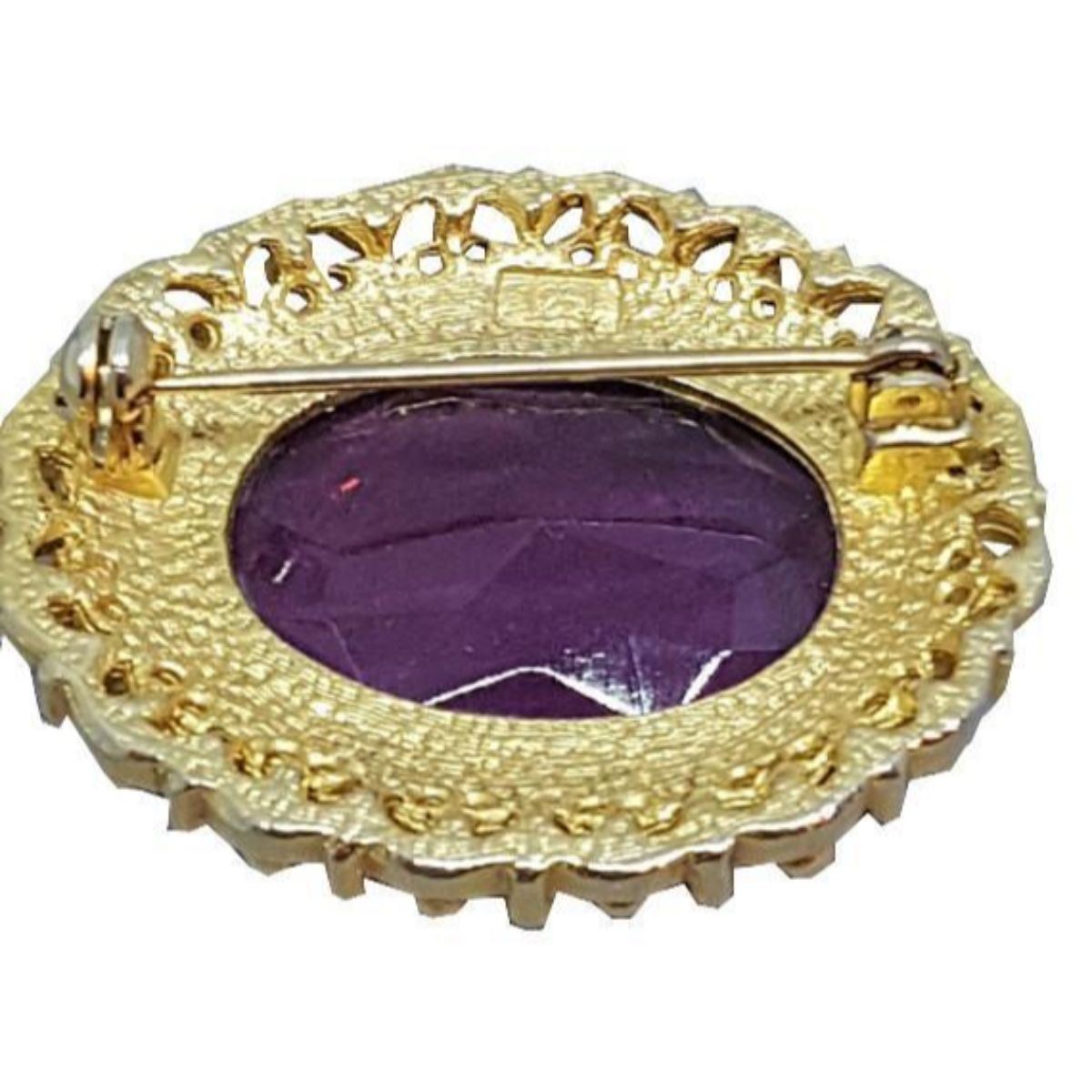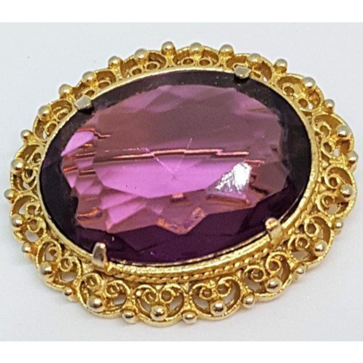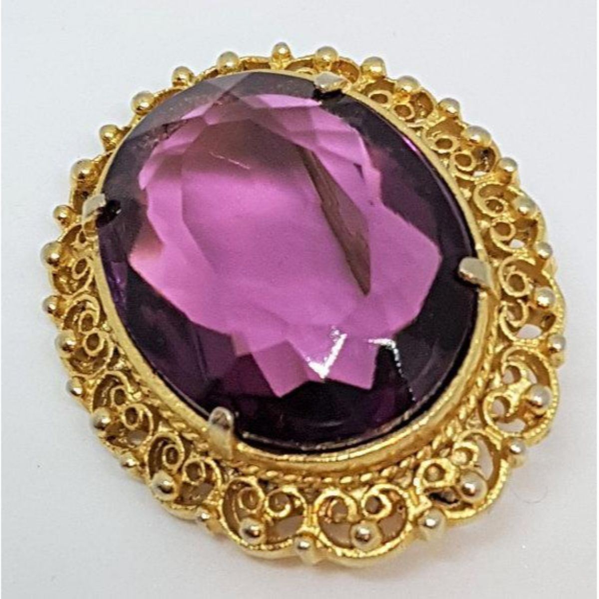 Description A sweet Scottish Celtic vintage shawl pin or broach, presenting as a large oval glass amethyst stone, prong set, embedded in a woven matrix of plated gold, and secured by a roll over clasp. It has the Spinx catalogue design number A1251 engraved on the frame at the back, and looks every bit a quality piece of jewellery. - 10050-032418-ES-81522