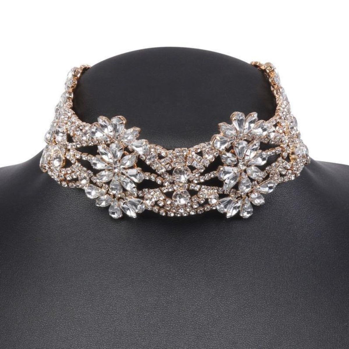 Designer Czech crystals set into a runway model, wide collar bib-style chunky choker necklace. 16"L. 9967-032618-EB-82605