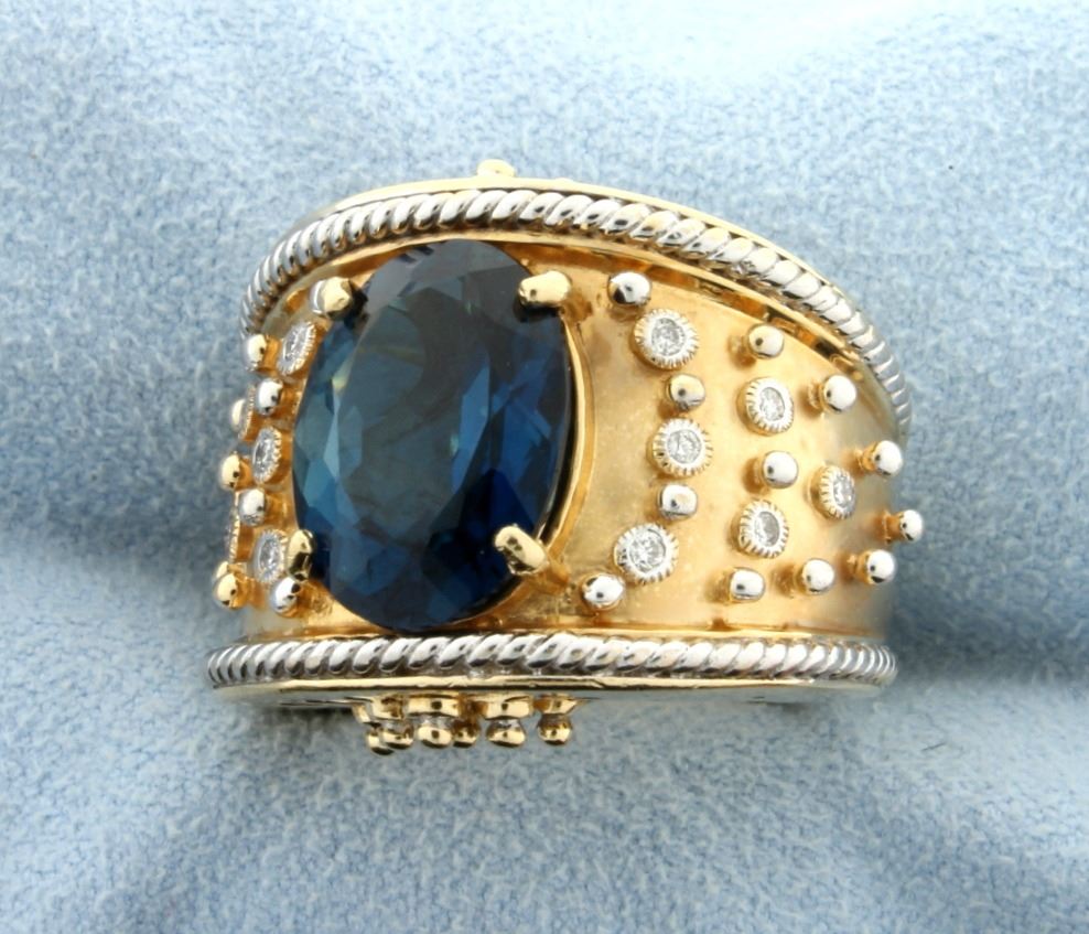 The gem quality AAA London Blue Topaz measures 14mmx10mm oval and is approx. 6 carats. There are 12 diamonds in a bezel set approx. total weight of 1/4 carat. Top diameter is 3/4". Size 7.5. 17.6g