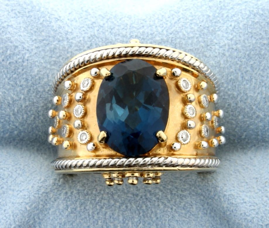 The gem quality AAA London Blue Topaz measures 14mmx10mm oval and is approx. 6 carats. There are 12 diamonds in a bezel set approx. total weight of 1/4 carat. Top diameter is 3/4". Size 7.5. 17.6g