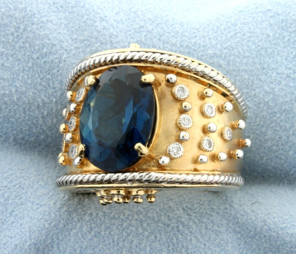 In 14k Yellow, White, and Rose Gold. The high quality AAA London Blue Topaz measures 14mmx10mm oval and is approx. 6 carats with an exceptional deep blue color and excellent clarity. There are 12 high quality round diamonds in a bezel set, 1/4 ct TW. Top diameter is 3/4". Size 7.5. 17.6g