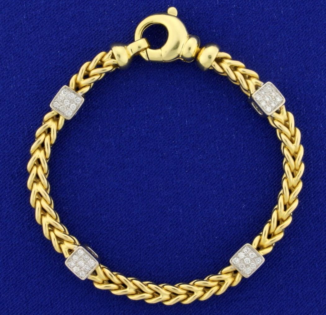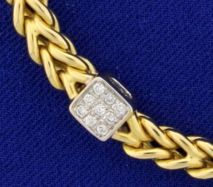 In 18k yellow and white gold. Contains 1/2ct TW of high quality diamonds of VS clarity/F color. 7 1/2" long and 6mm thick with lobster clasp. 31.5g.