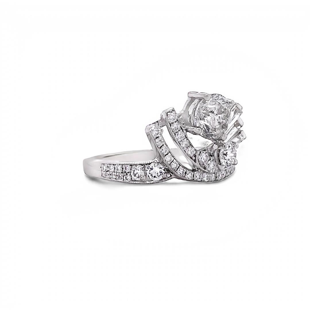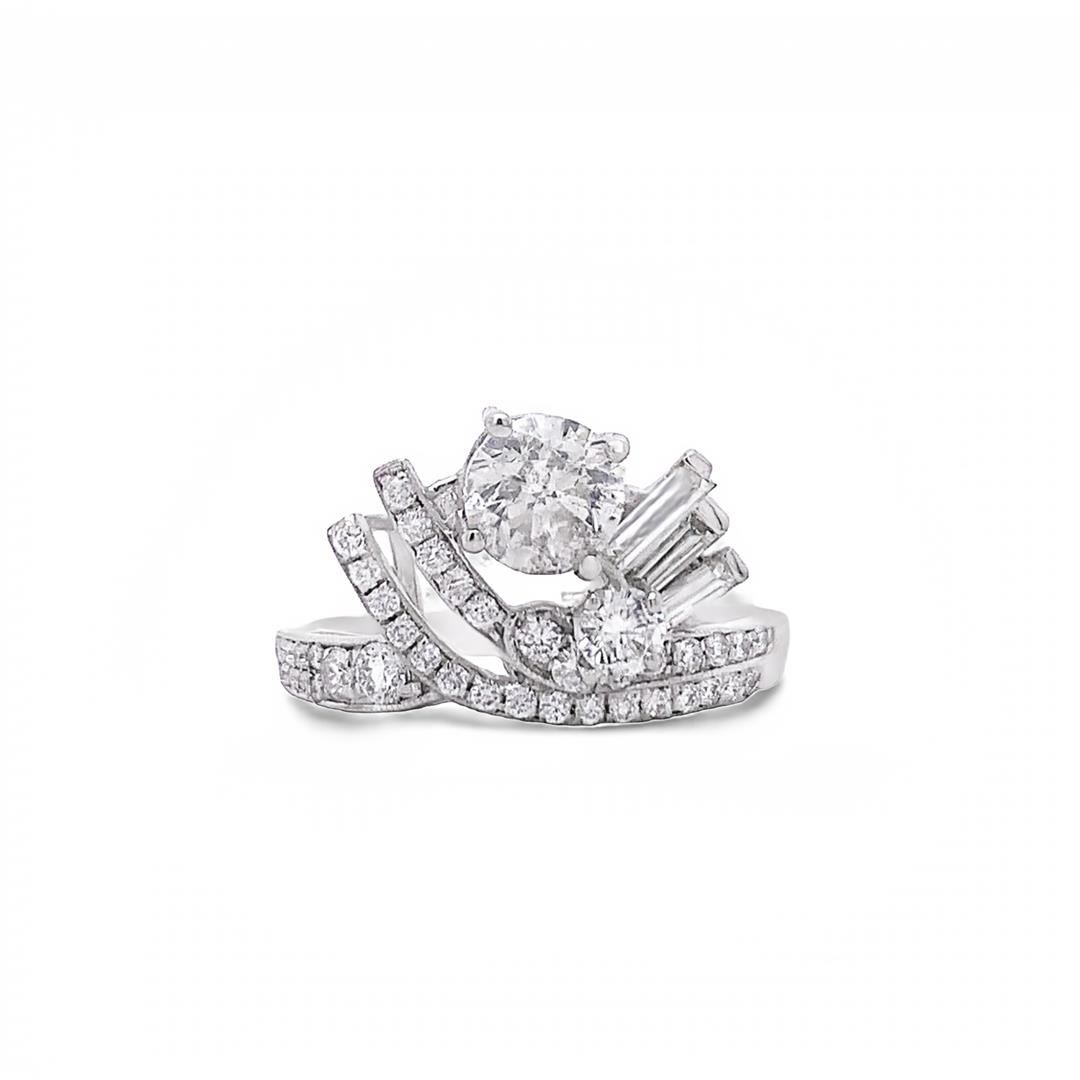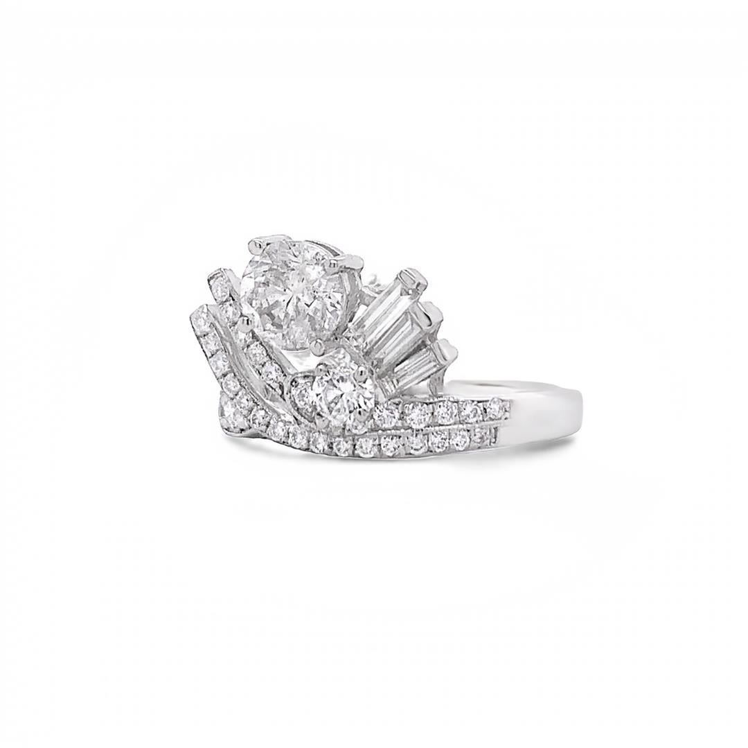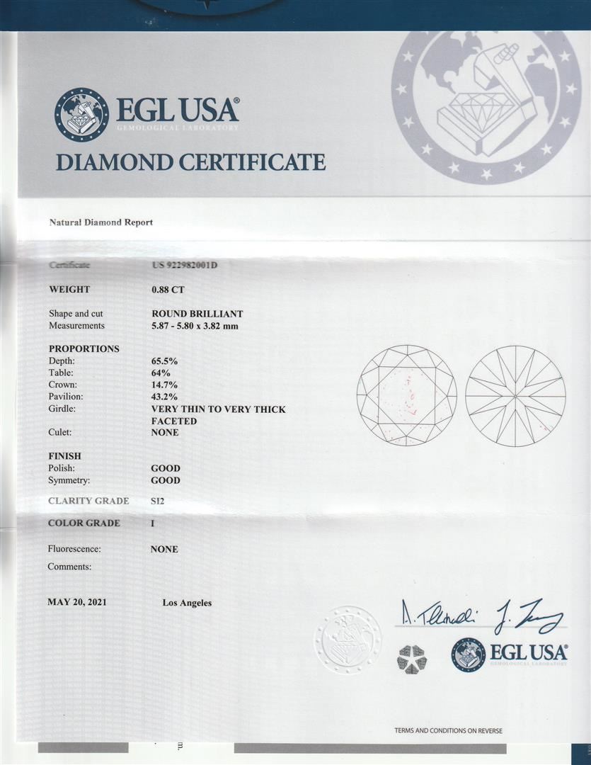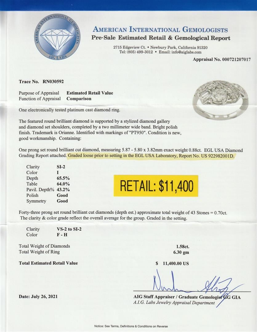 Designer Diamond Engagement Ring .88ct. Please see Photos and Description for all available information. This unique engagement ring features a .88ct diamond in the center surrounded by round diamonds and baguettes. The platinum band is a perfect match to the diamond, adding to its brilliance. EGL Certified