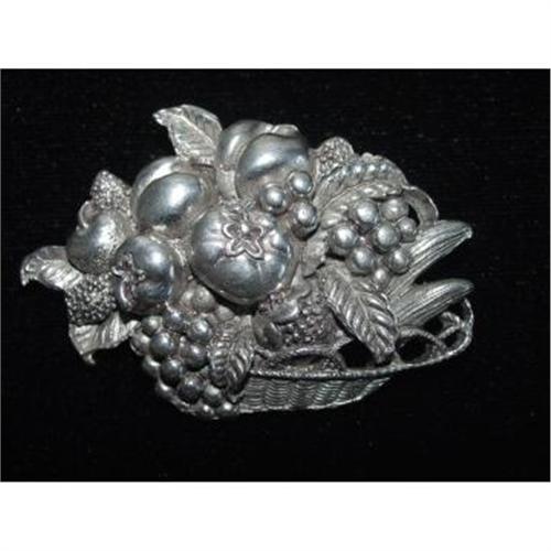<tr><td>Title: Designer Fruit basket pewter pin signed </td></tr>