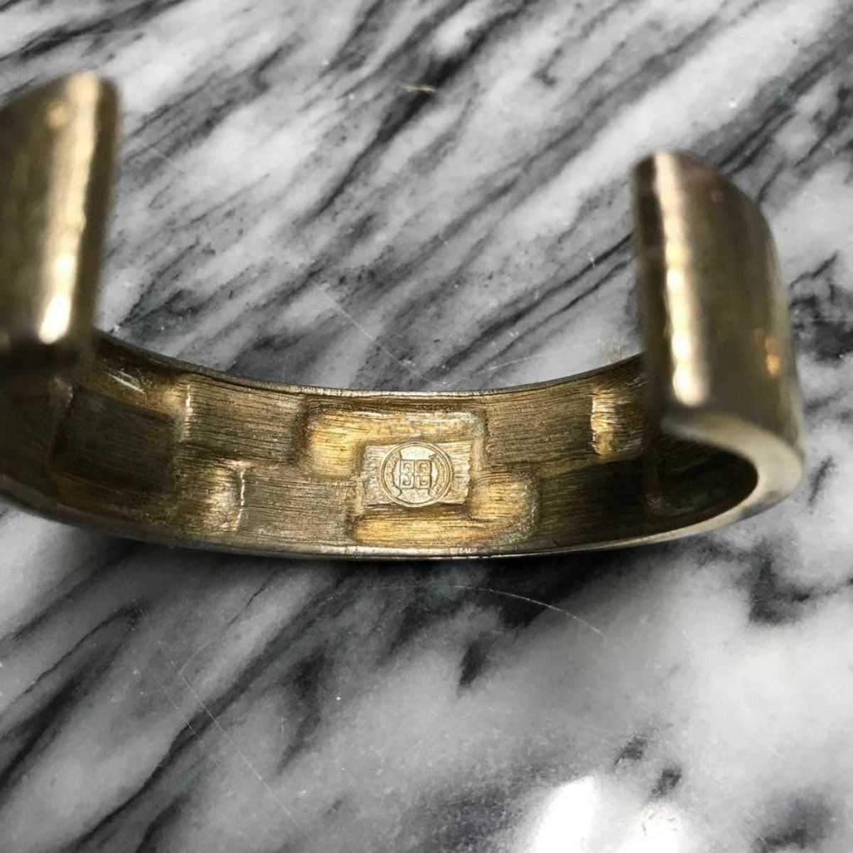 Givenchy mid century modern design cuff bracelet & matching earrings set. Gold tone metal, stamped Givenchy on interior, inset with golden tone, orange & green gold glass panels. Matching clip on earrings with gold glass inserts, also stamped Givenchy. 2 1/2" D cuff bracelet, fits 7" wrist with 1/2" X 1" earrings. * some gold tone loss on bracelet due to age & wear, otherwise a fantastic matching vintage set. Â