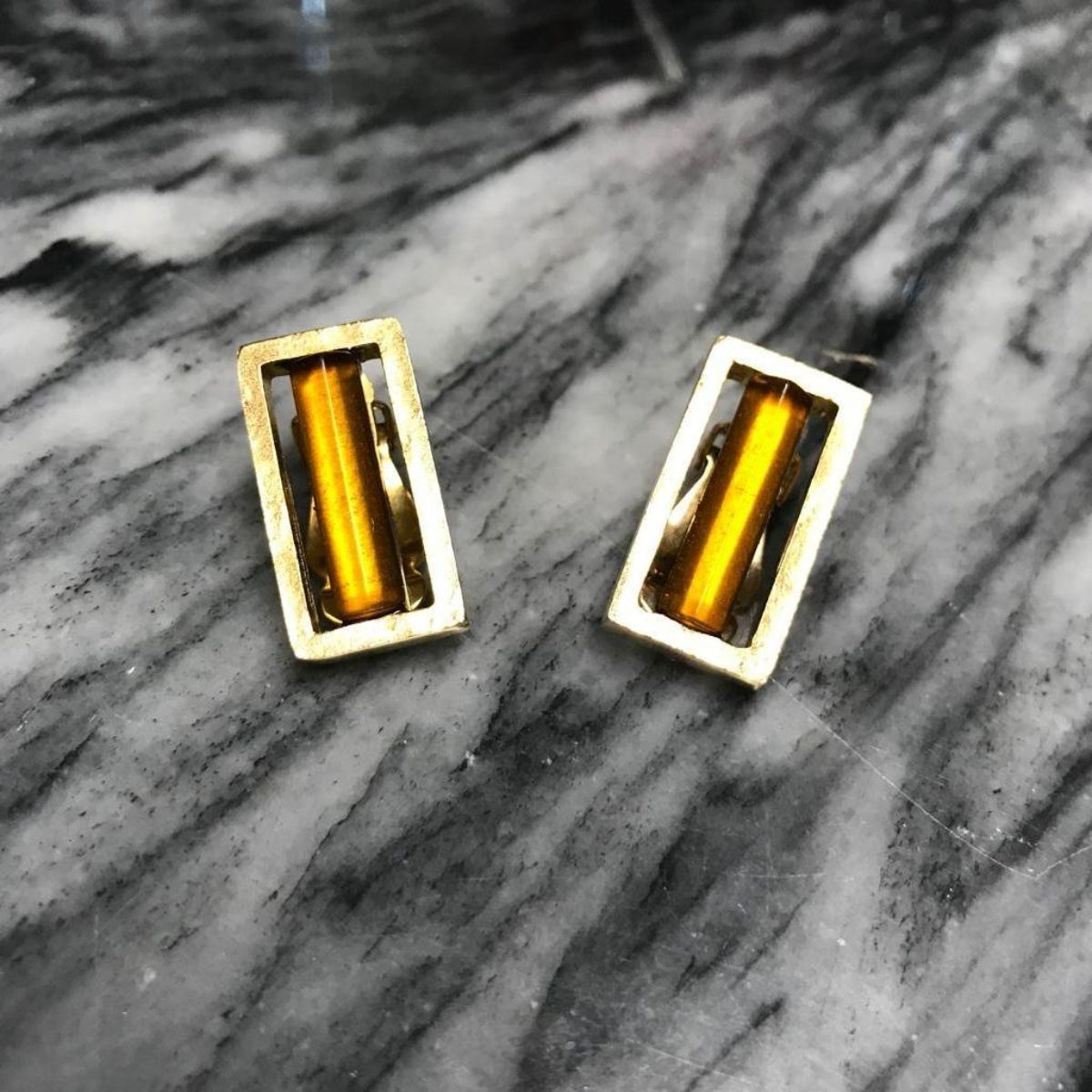 Givenchy mid-century modern design cuff bracelet & matching earrings set. Gold-tone metal, stamped Givenchy on the interior, inset with a golden tone, orange & green gold glass panels. Matching clip-on earrings with gold glass inserts, also stamped Givenchy. 2 1/2" D cuff bracelet, fits 7" wrist with 1/2" X 1" earrings. * some gold-tone loss on bracelet due to age & wear, otherwise a fantastic matching vintage set. Â