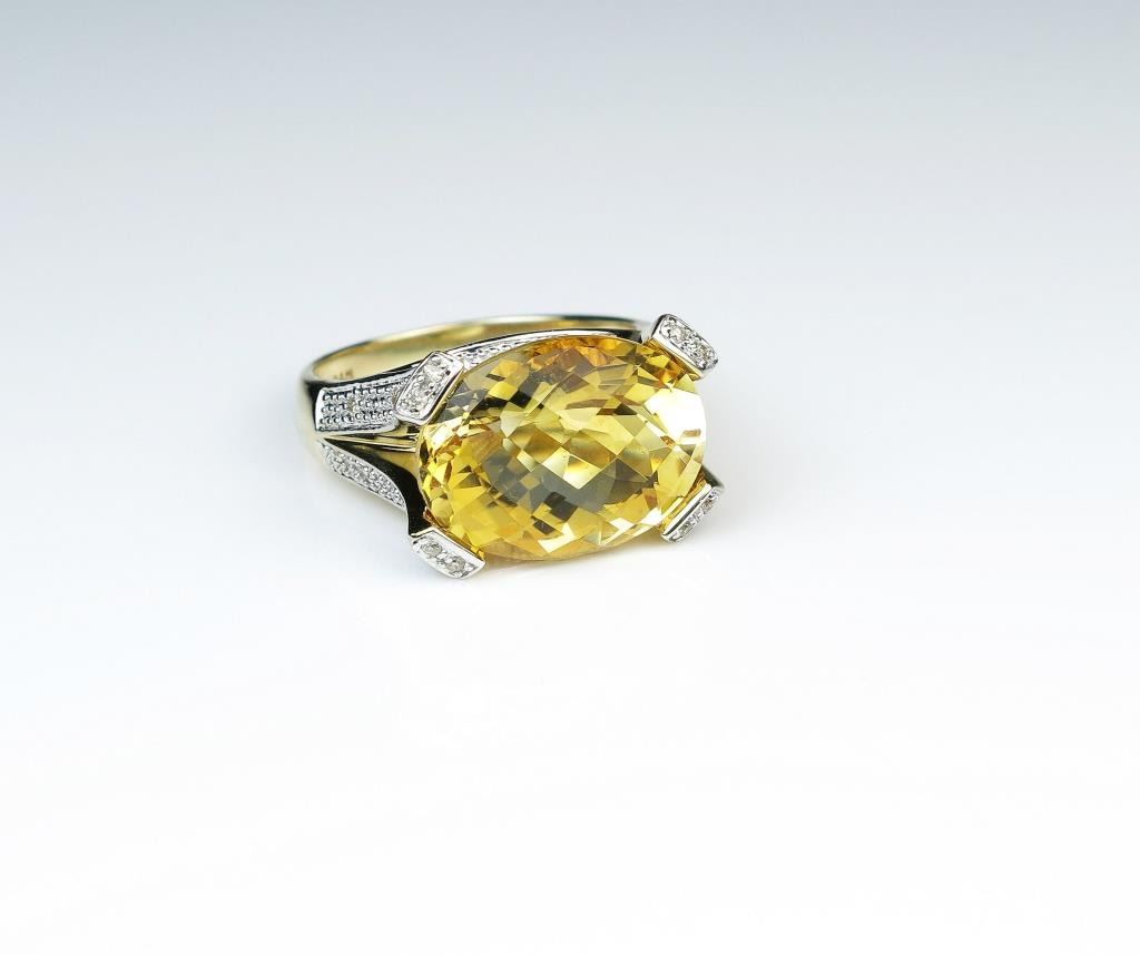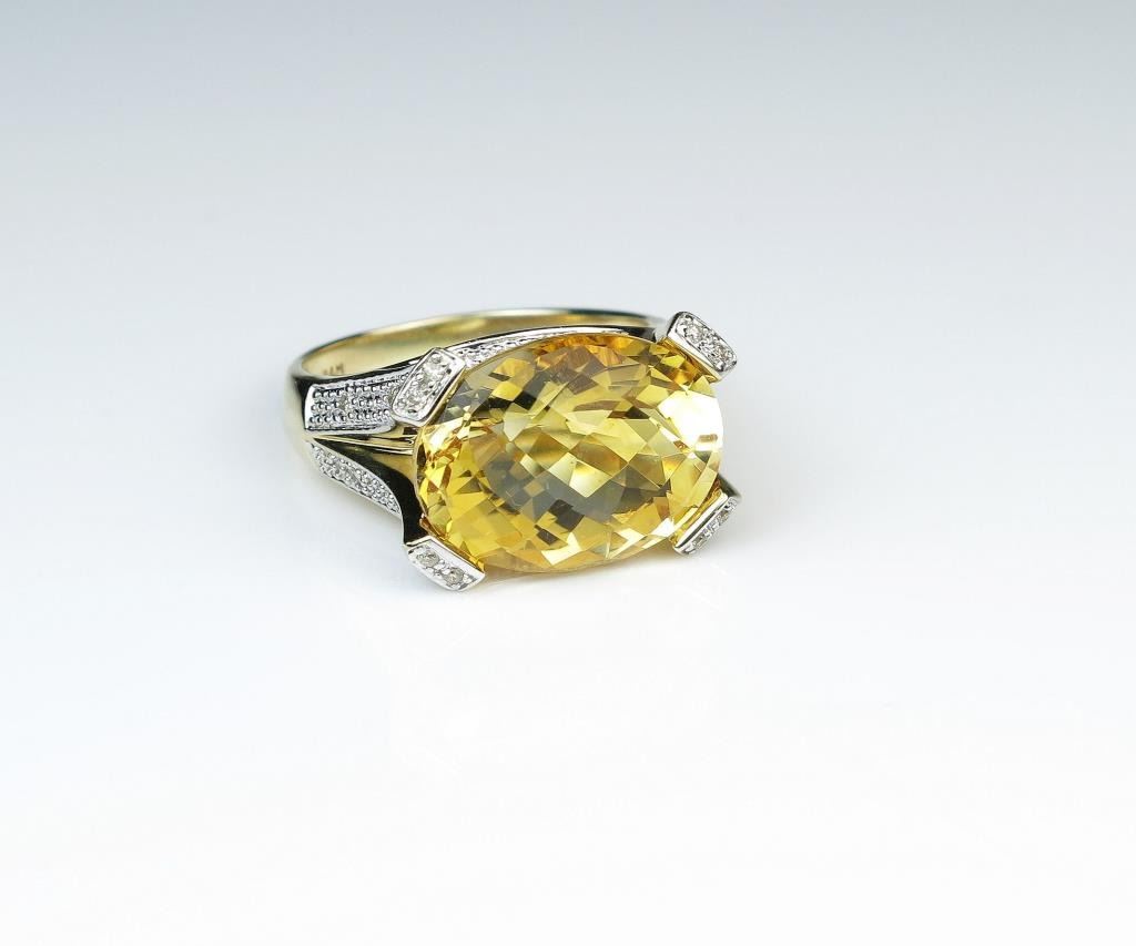 Features an oval checkerboard cut Citrine weighing approx. 6.00 carats accented with 16 round cut Diamonds with H-I colors set in 14 karat yellow and white gold setting.