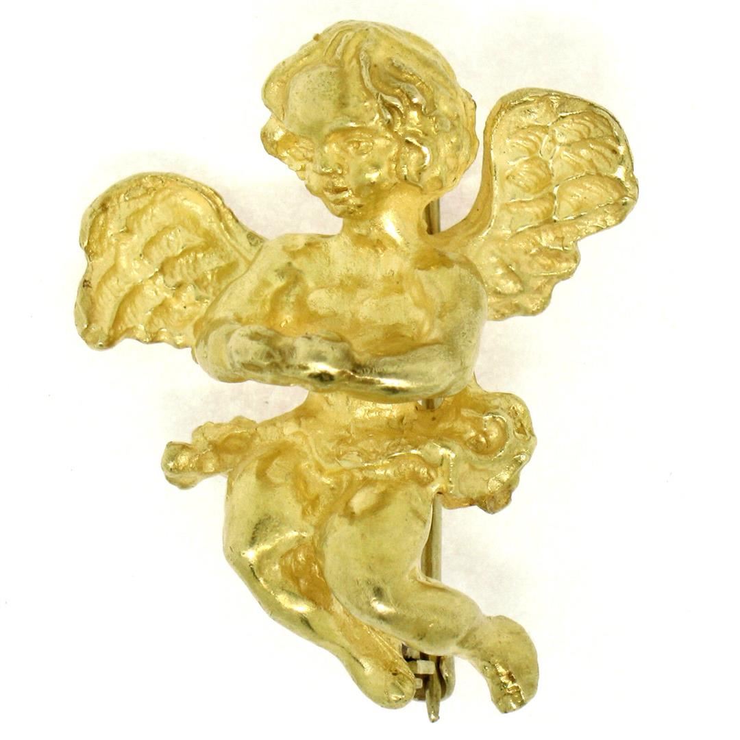 An estate solid 18k yellow gold 3D cherub angel brooch by Koven. Measures 31.50x25.80mm and weighs a total of 20.08 grams.