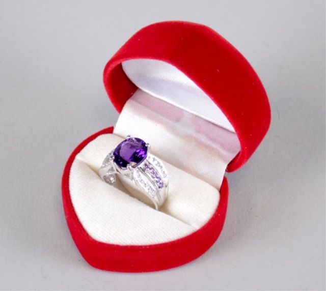 4 ct. amethyst and accented by Cz's and amethyst in .925 sterling mount, size 7.5, rhodium plated.