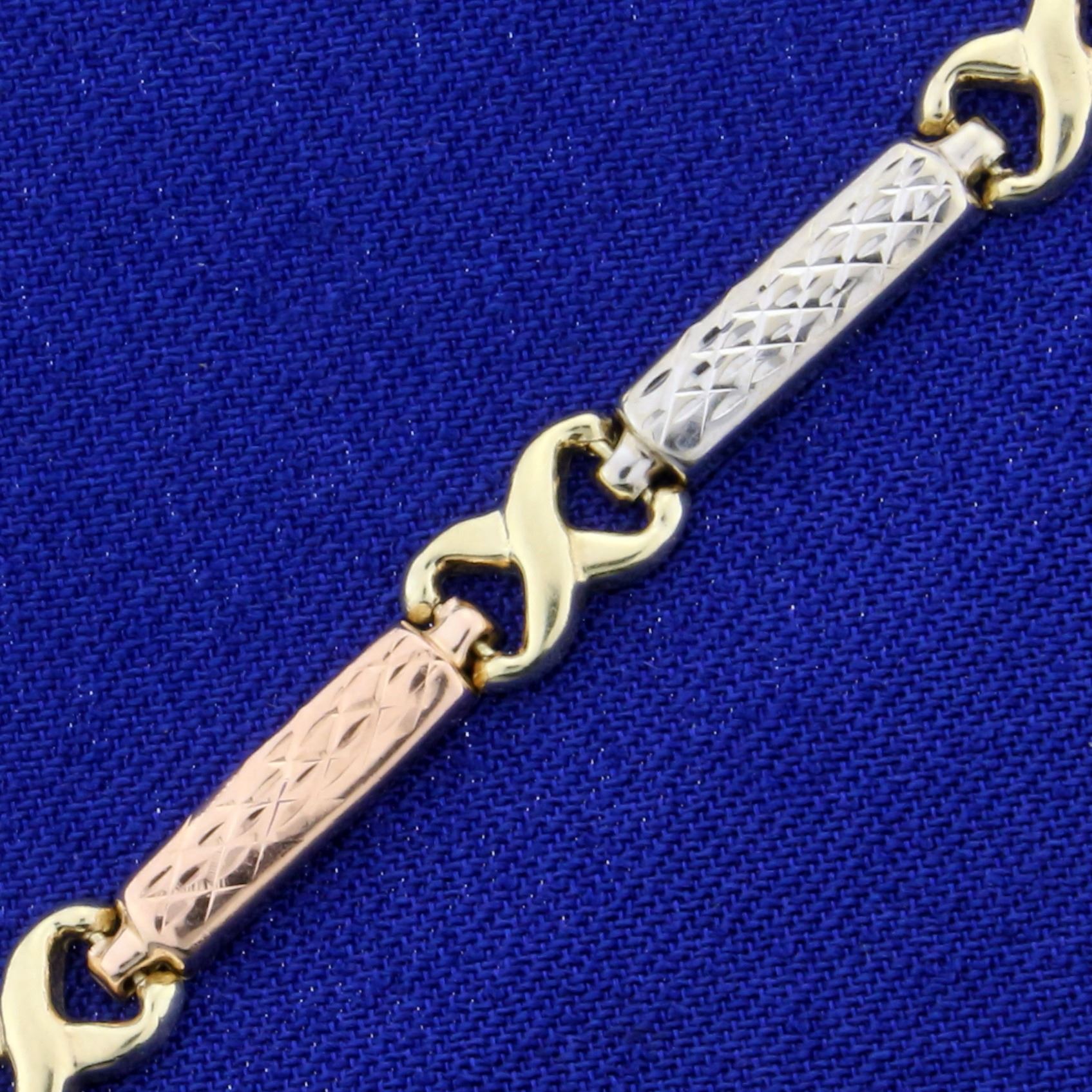 In 14K Yellow, White, and Rose Gold. 7 1/2 inches long, 3.4mm wide. Alternating White and Rose Gold links separated by Yellow Gold links. With lobster clasp. 3.2g.