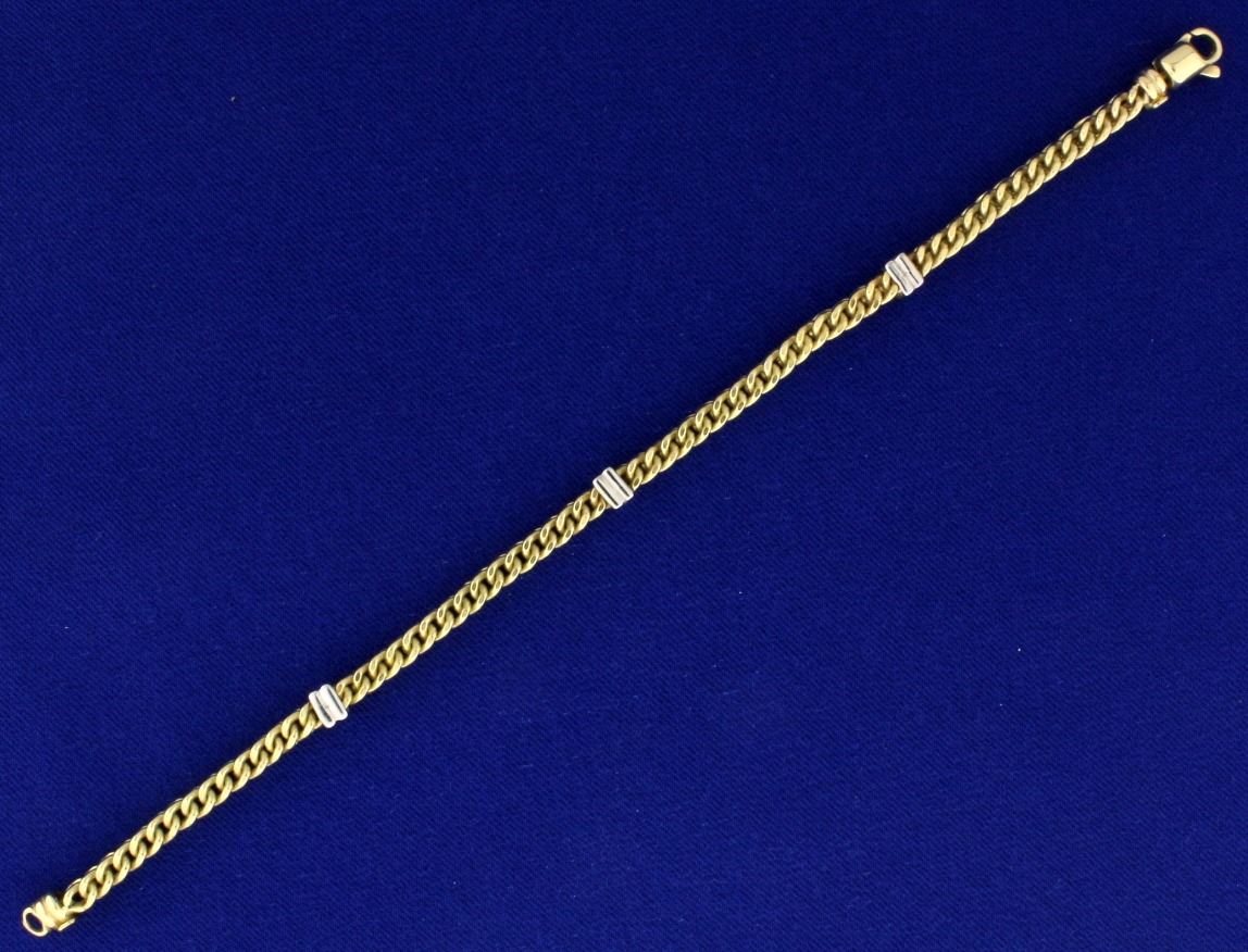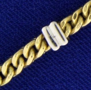 In 14k yellow and white gold, containing a very unique 4 sided design with cuban link look on two sides and "V" look on the other two sides. 7 1/8 inches long. 8.1g.