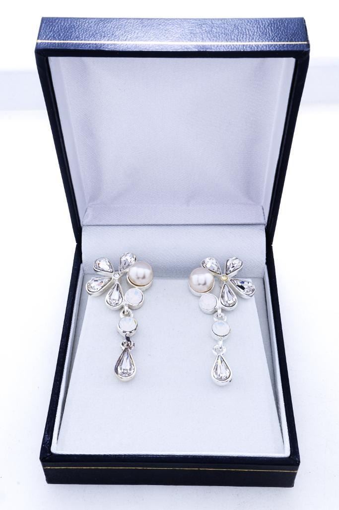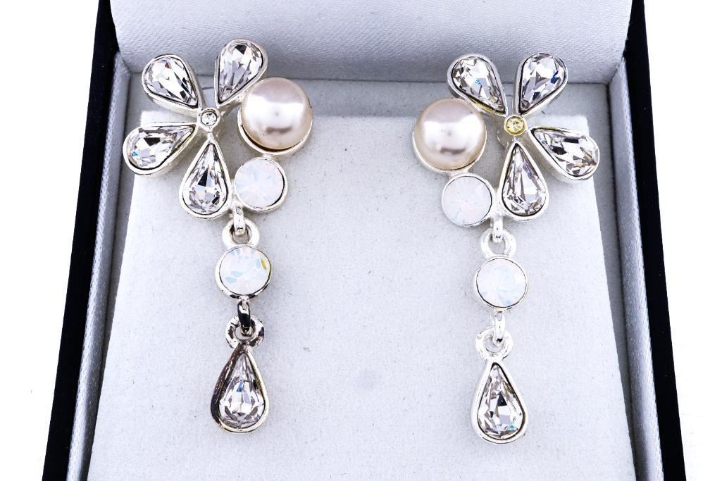 Designer "MM" Crystal Fancy Drop Earrings, Opalites & Pear Cut Bezel Set Swarovski Elements.