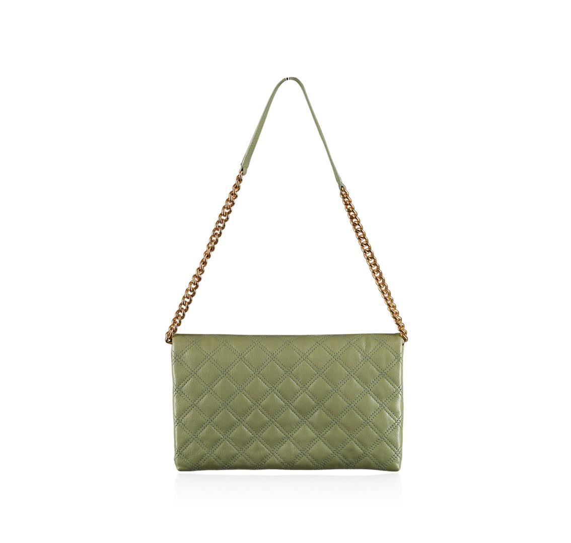 New with Tags Designer Marc Jacobs Bag. Quality matched by no other, a Marc Jacobs quilted shoulder bag is the everyday essential every woman should be lucky enough to own. Moss green quilted leather with tonal topstitching and gold hardware. Removable should strap with chain insets. Flap over magnetic closure. Canvas Lining inside, one zip pocket. 7"H x 11 1/4" W x 1 1/2" D, Imported.