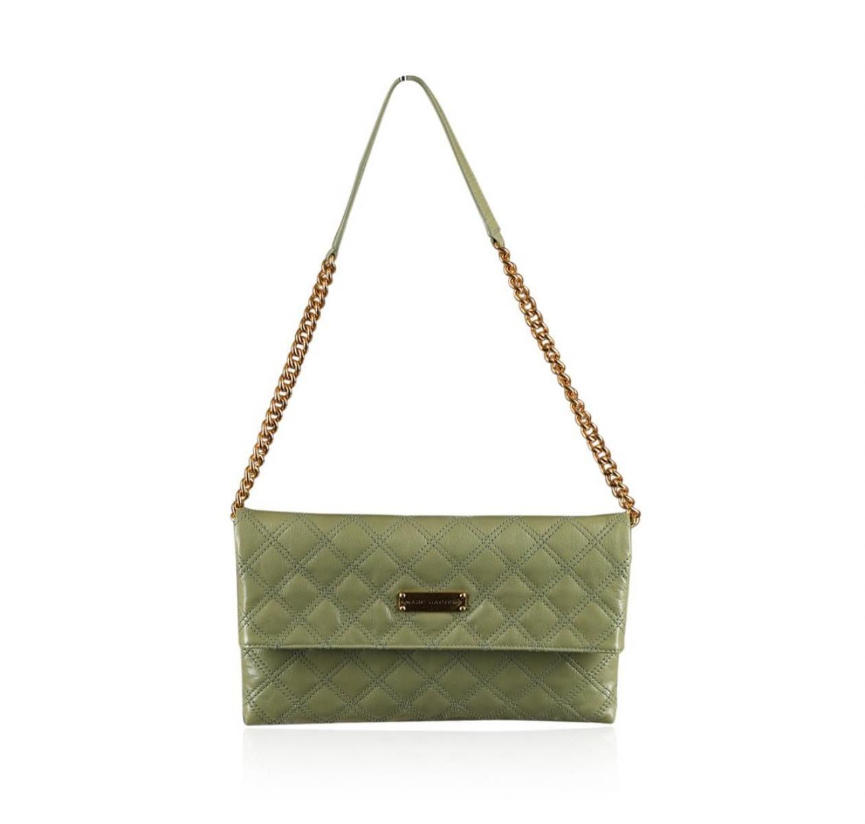 New with Tags Designer Marc Jacobs Bag. Quality matched by no other, a Marc Jacobs quilted shoulder bag is the everyday essential every woman should be lucky enough to own. Moss green quilted leather with tonal topstitching and gold hardware. Removable should strap with chain insets. Flap over magnetic closure. Canvas Lining inside, one zip pocket. 7"H x 11 1/4" W x 1 1/2" D, Imported.