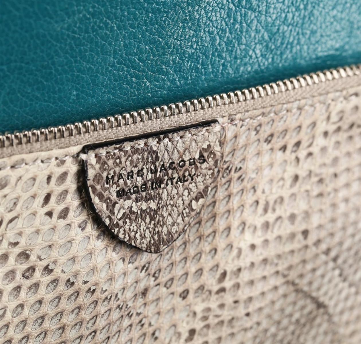 New with Tags Designer Marc Jacobs Bag. A genuine snakeskin pouch is incorporated into the design of a sleek zip-top shoulder bag suspended from a densely linked chain strap. Dual top-zip closures. Exterior zip pocket. Interior wall pocket; four card slots. Leather with genuine snakeskin trim. Imported. Chained shoulder strap, 11" drop. One outside zip pocket. One inside open pocket. Cotton Lining. 10.5"W x 6.5" H x 1.75"D. Made in Italy.