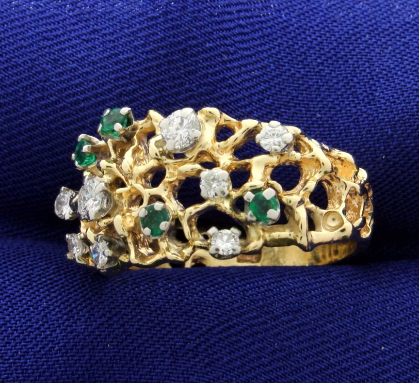 In 14k Yellow Gold. There are 4 natural high quality emeralds totaling 1/4ct TW. The emeralds have a very nice bright green color with excellent clarity. There are also 8 very high quality brilliant cut diamonds, 1/2 ct TW, VS clarity and G color. Band is 13mm wide. Size 10. 7.2g