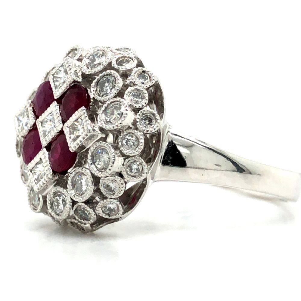 ADDITIONAL INFORMATION: This is a delightfully modern platinum ring that features round, faceted rubies that are set in a checkerboard pattern with round, brilliant-cut and princess-cut, bezel-set diamonds with milgrain borders. The ring is fashioned in a button-top style by designer Orianne. It has an ornate and supportive under gallery and an approximate 3 mm shank.