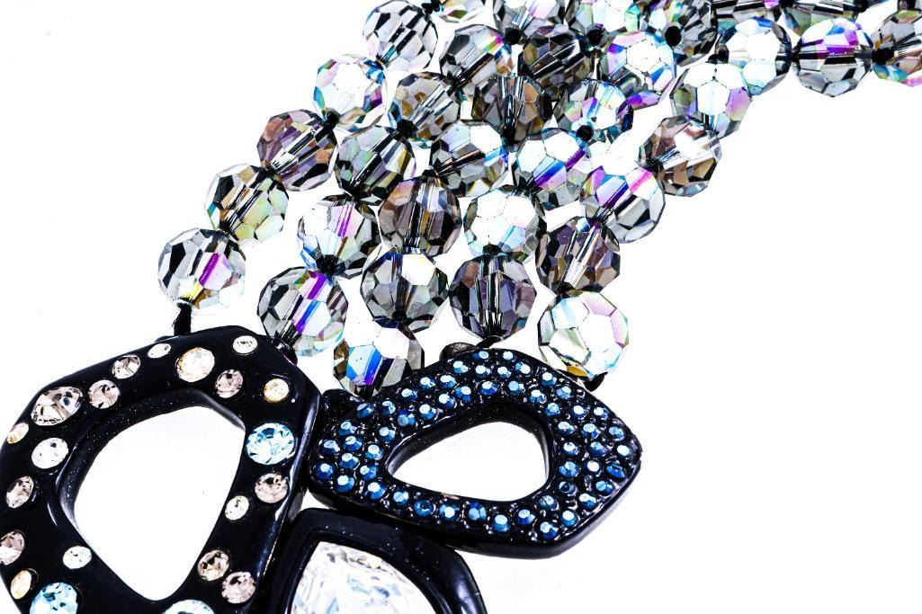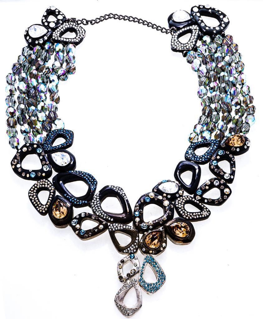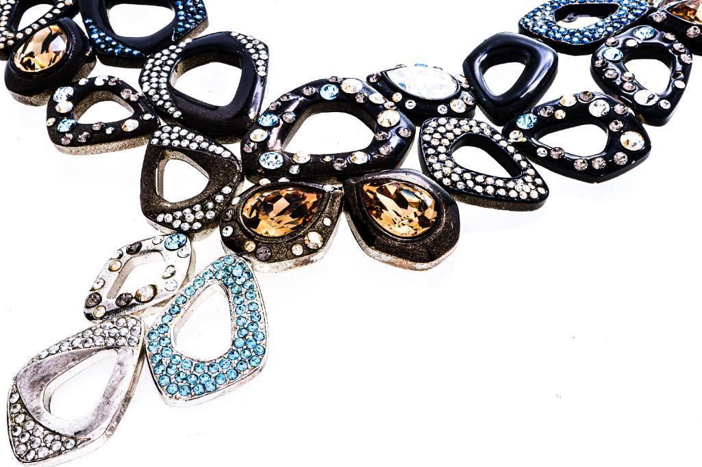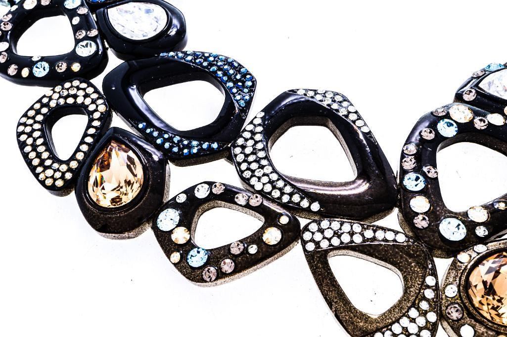 Designer Show Piece - Antique Black Gold Plating/Silver /Rhodium,Choker Style, 5 Strands on Each side Swarovski Crystals,Hand Made Fancy Links to form two rows of Bead & Bezel Set Swarovski Elements. "M" Signature Attached, One of a kind piece worn one time by a model for a Famous Designer Clothing photo shoot.