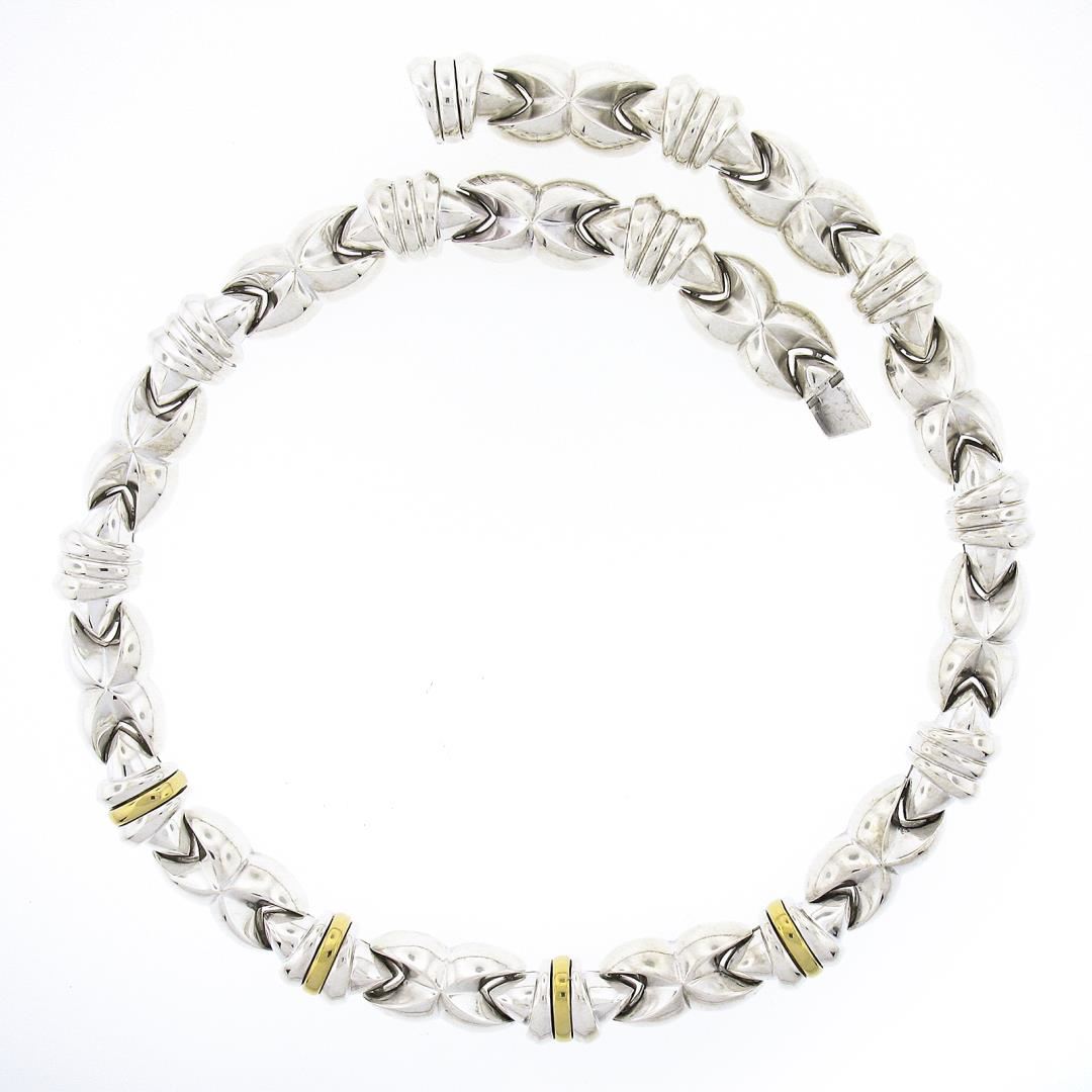 a solid silver & 18k yellow gold collier necklace. It weighs a total of 152.65 grams, measures 13.6mm wide, and measures 17.5 inches in length.