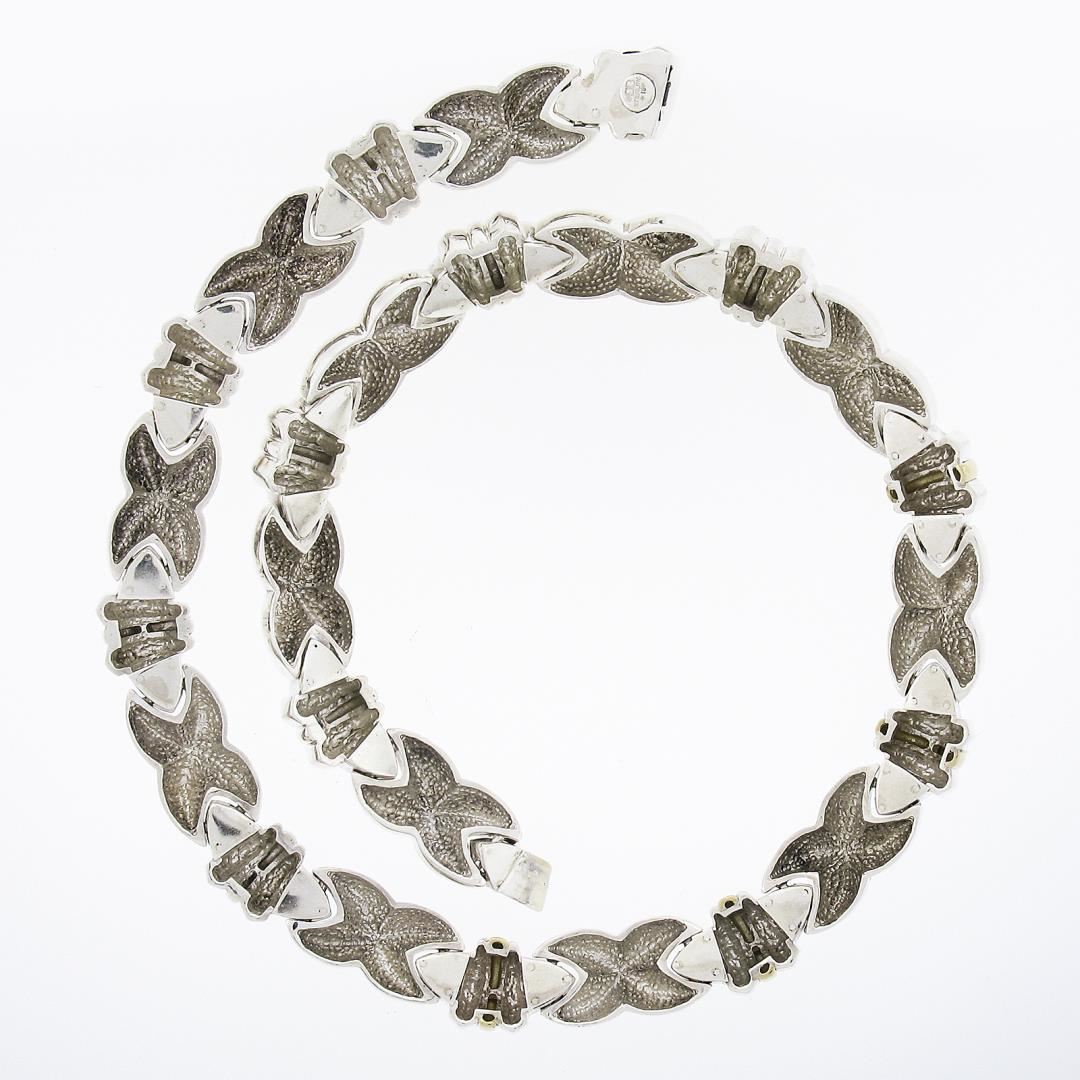 a solid silver & 18k yellow gold collier necklace. It weighs a total of 152.65 grams, measures 13.6mm wide, and measures 17.5 inches in length.