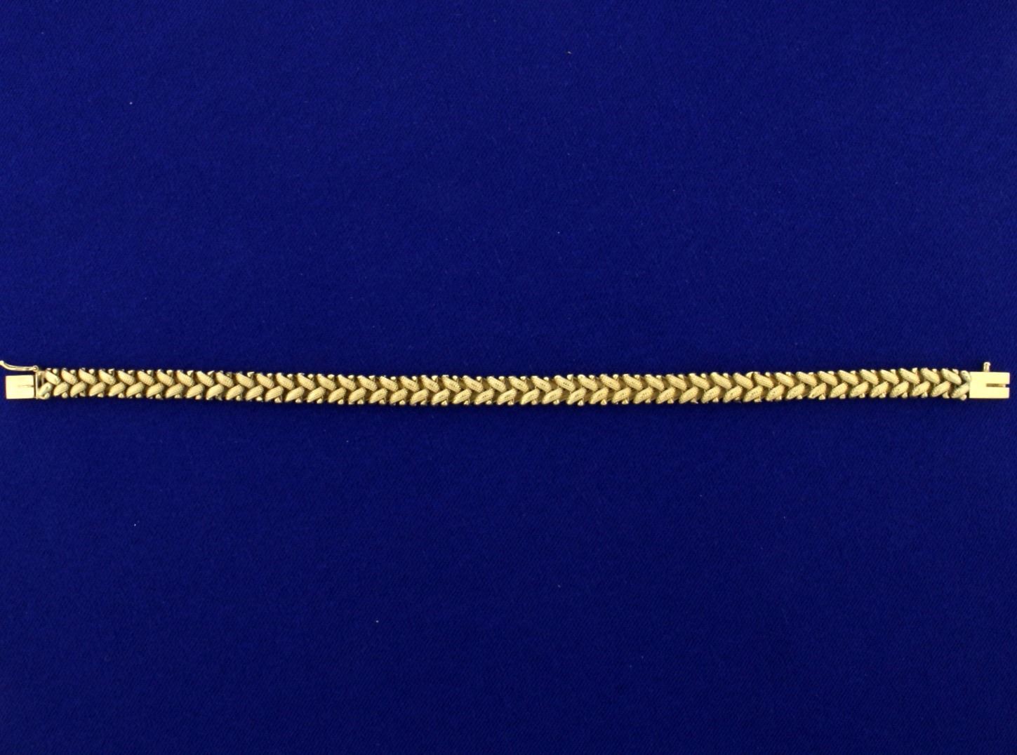In 14k yellow gold. 7 inches long and 6mm wide with safety clasp. 11.7g.