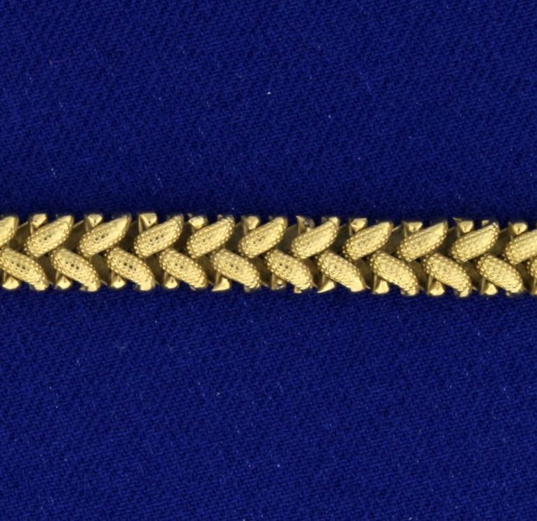 In 14k yellow gold. 7 inches long and 6mm wide with safety clasp. 11.7g.