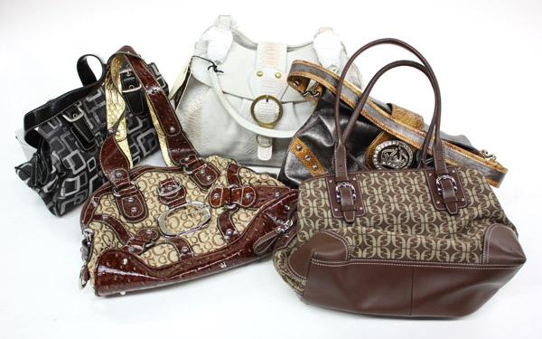 (lot of 5) Designer leather and canvas purses by Marc Chantal, Fossil, Guess, Charlie Lapson, and Nine West in various styles and colors