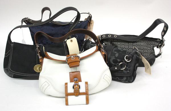 (lot of 5) Coach designer shoulder bags in various styles including white and brown leather with matching wallet, monogram canvas in navy, black, and charcoal