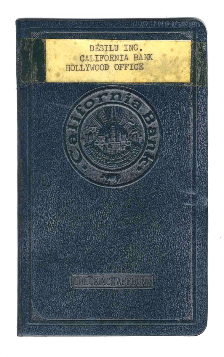 California Bank checking account booklet for Desilu, Inc., production company jointly owned by Lucille Ball and Desi Arnaz. Booklet contains 34 entries spanning from 30 November 1954 to 1 August 1958. Entries are date stamped by the bank with additional handwritten initials and the amount either being deposited or withdrawn. The more common initials are ''MB'', ''NK'' and simply ''S''. 3.25'' x 5.25'' blue leatherette booklet is in very good condition.